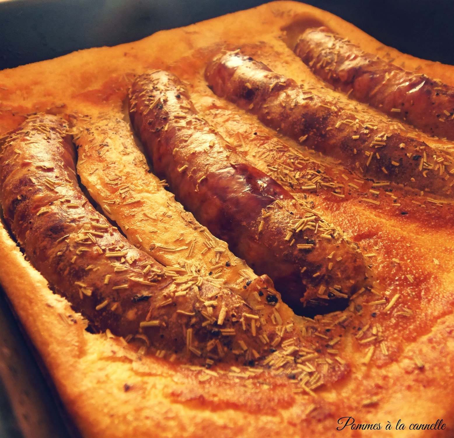 Formę z podsmażonymi kiełbaskami wyjąć z piekarnika, wylać do niej masę, posypać rozmarynem (lub listkami świeżego) oraz odrobiną świeżo zmielonego pieprzu i wstawić do piekarnika.